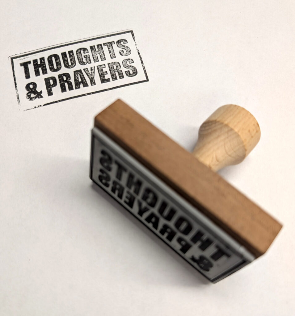 This rubber stamp reduces a familiar public response to its most mechanical form. Thoughts and Prayers is presented not as