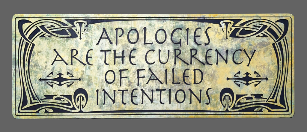 This rectangular sign pairs elegant form with a sharp observation. Apologies Are the Currency of Failed Intentions is rendered in