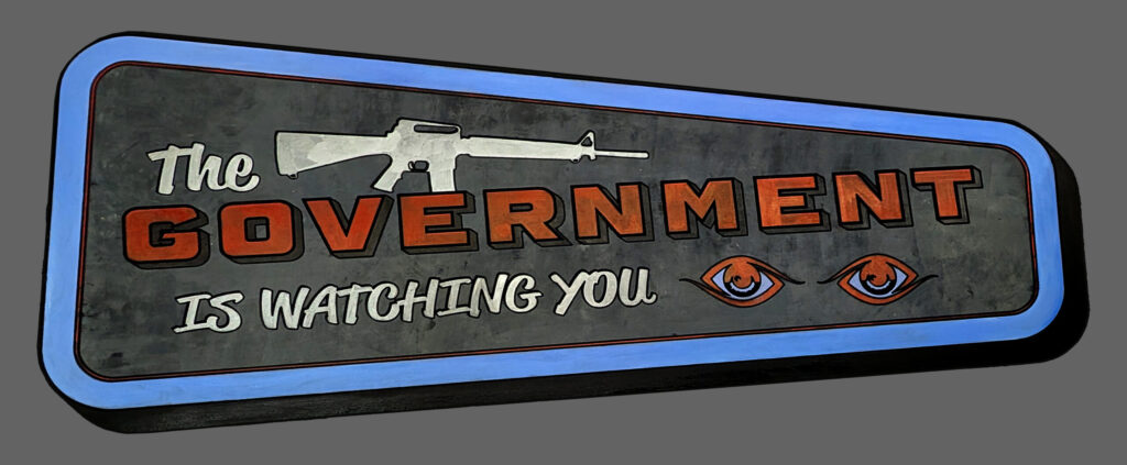 This sign combines a sense of threat with stylized visual tension. The Government Is Watching You is rendered on a