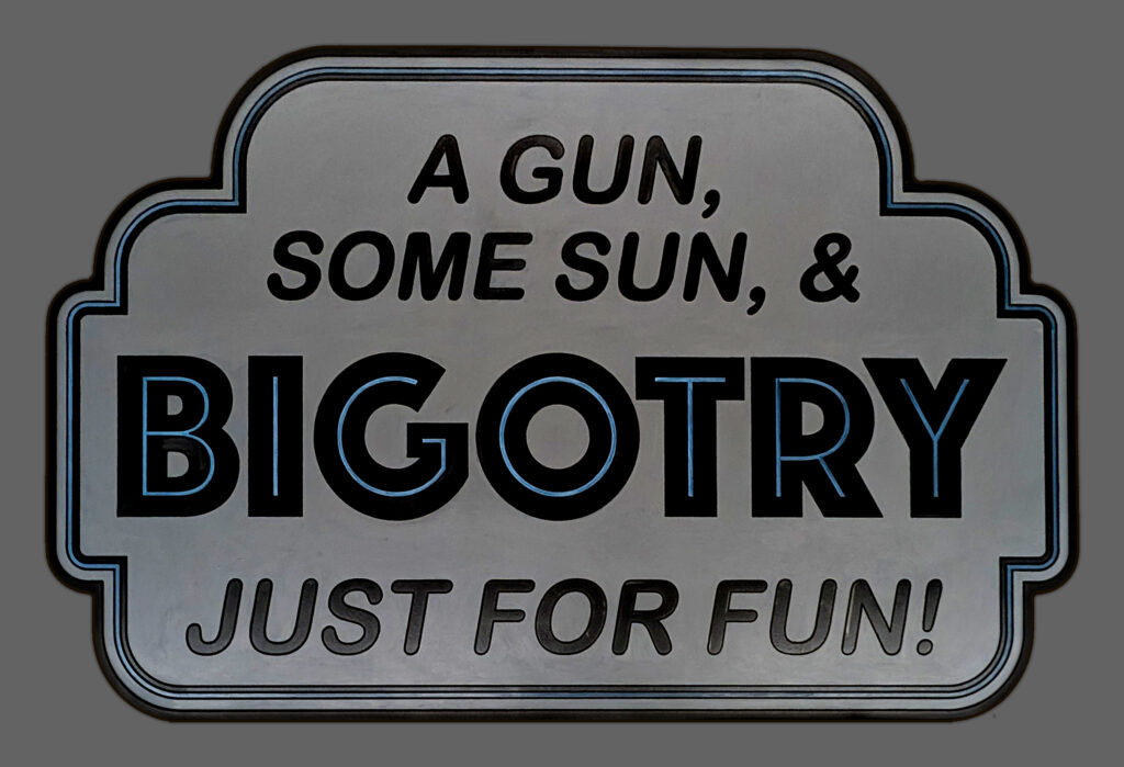 This sign strips imagery and language to their barest elements, delivering a stark, almost brutal message. A Gun, Some Sun,