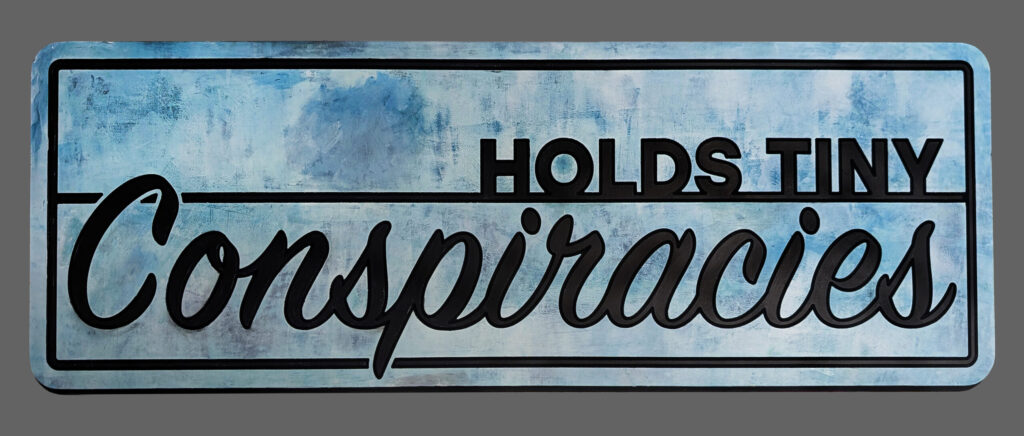 This small rectangular sign celebrates the subtle thrill of keeping a secret. Holds Tiny Conspiracies is rendered in crisp black