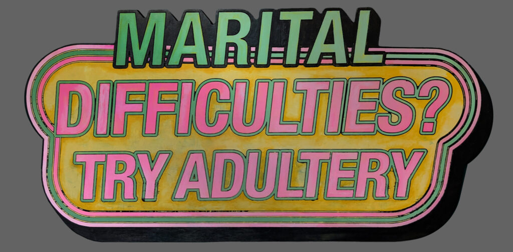 This sign turns the exuberance of vintage advertising into biting social commentary. Marital Difficulties? Try Adultery! is rendered in a