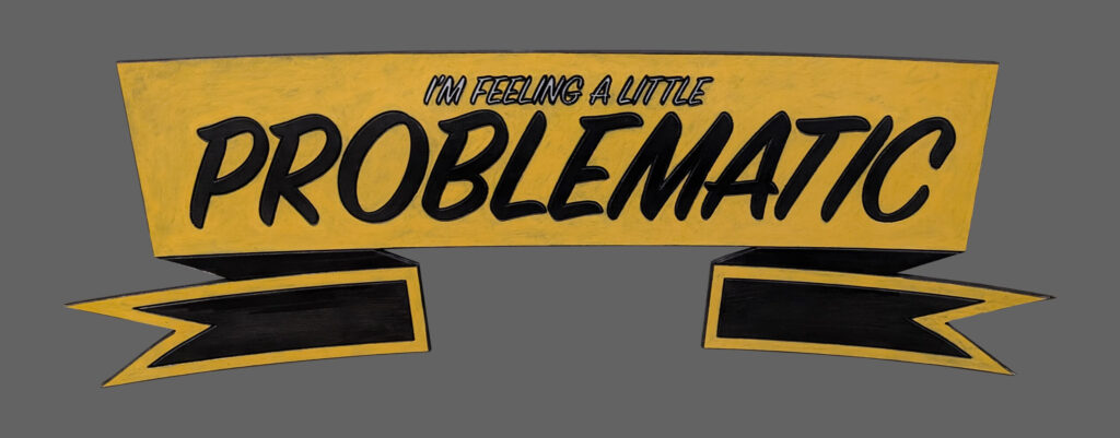 This small banner style sign turns personal mischief into a playful object. Feeling a Little Problematic is rendered in black